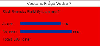 Jag tycker att vi måste få stopp på allt snack att rallyt skall flyttas norrut i Sverige!!! Alla vi som håller på med rally på seriöst vis vet att man inte flyttar en så stark organisation. Men vad man måste göra är att flytta sig norr ut i värmland. Rallyts norra gräns i dag måste bli rallyts södra gräns då tror jag vi har ett mycket säkrare vinterlandskap. Men fortfarande skall Karlstad vara start & mål plats.